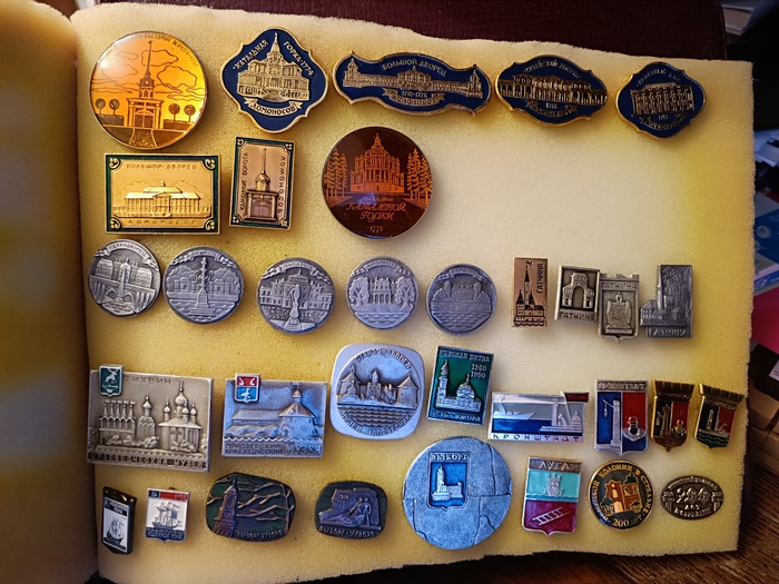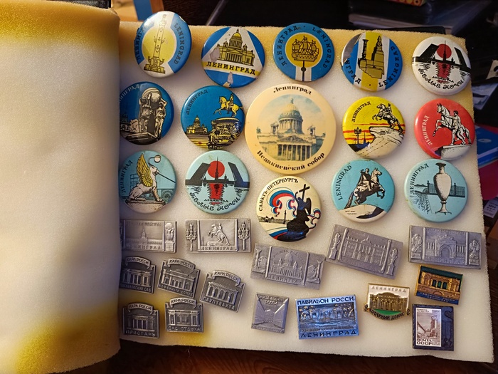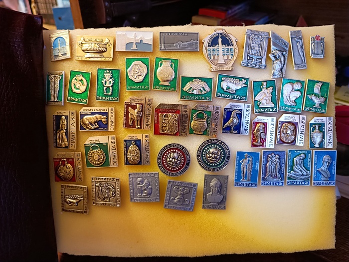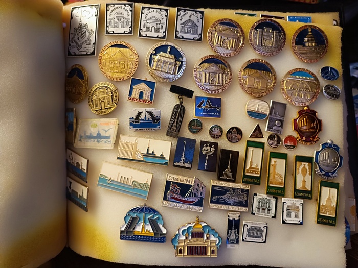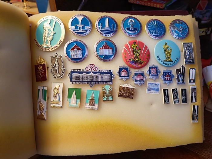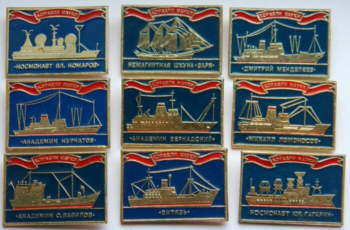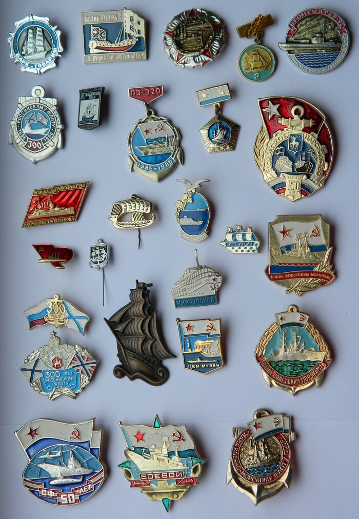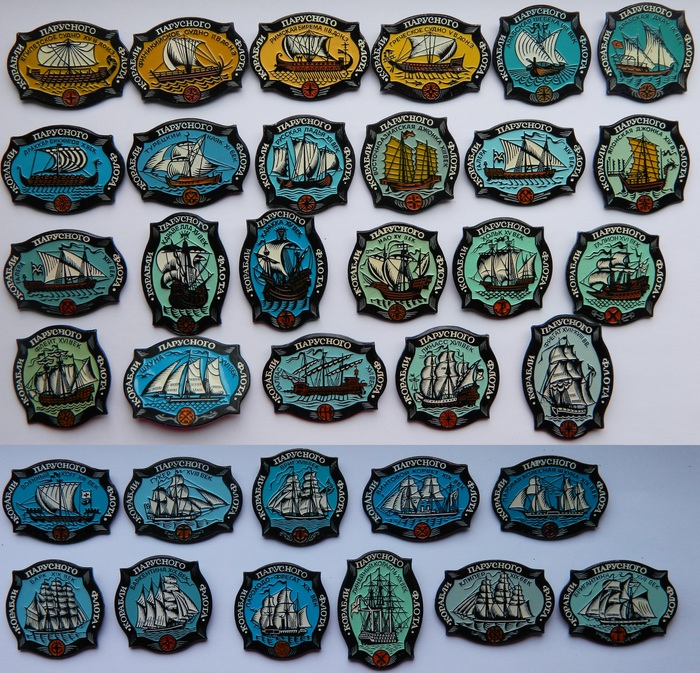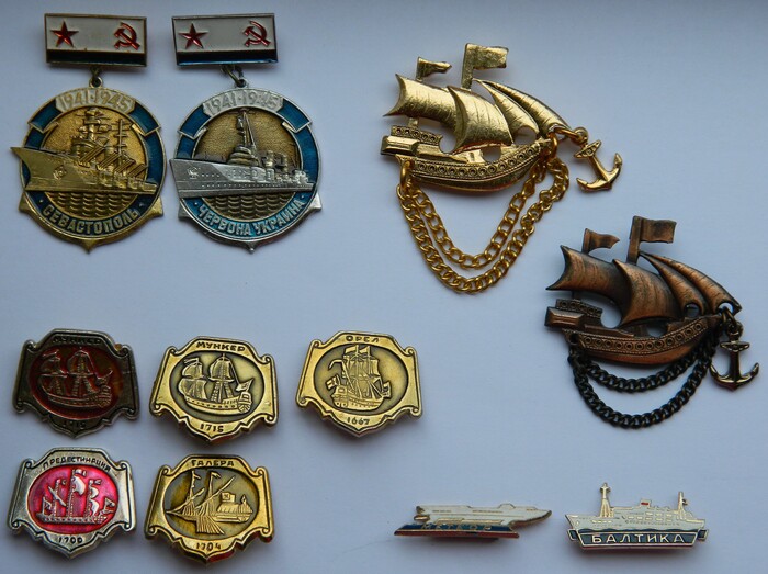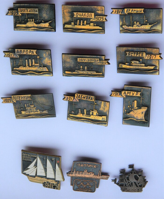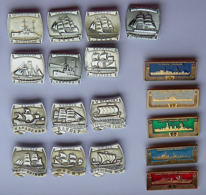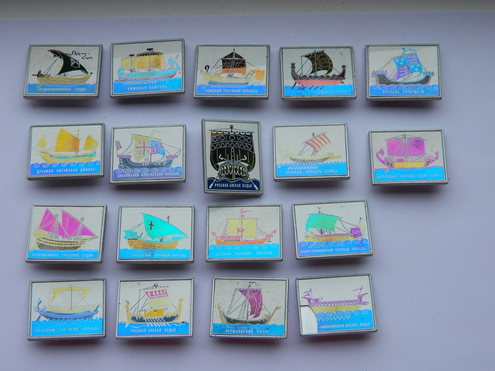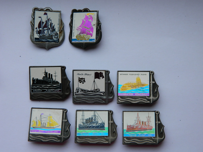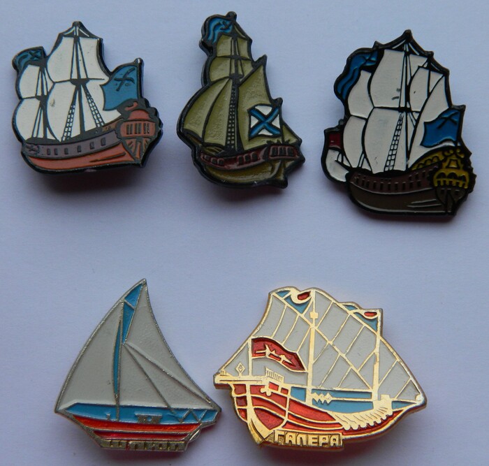 Набор "Петровские корабли" (правый верхний угол) - полный, встречали ещё значки другой покраски - и красные, и голубые с теми же названиями.