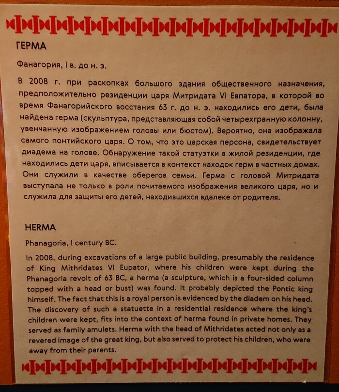 В 2008 г. при раскопках большого здания общественного назначения, предположительно резиденции царя Митридата VI Евпатора, в которой во время Фанагорийского восстания 63 г. до н. э. находились его дети, была найдена герма (скульптура, представляющая собой четырехгранную колонну, увенчанную изображением головы или бюстом). Вероятно, она изображала самого понтийского царя. О том, что это царская персона, свидетельствует диадема на голове. Обнаружение такой статуэтки в жилой резиденции, где находились дети царя, вписывается в контекст находок герм в частных домах. Они служили в качестве оберегов семьи. Герма с головой Митридата выступала не только в роли почитаемого изображения великого царя, но и служила для защиты его детей, находившихся вдалеке от родителя.