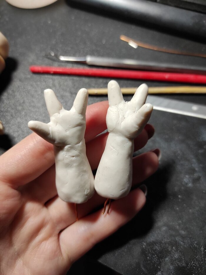 Я сделала модель головы и конечностей из полимерной глины. Чтобы потом отлить их из прочного пластика.