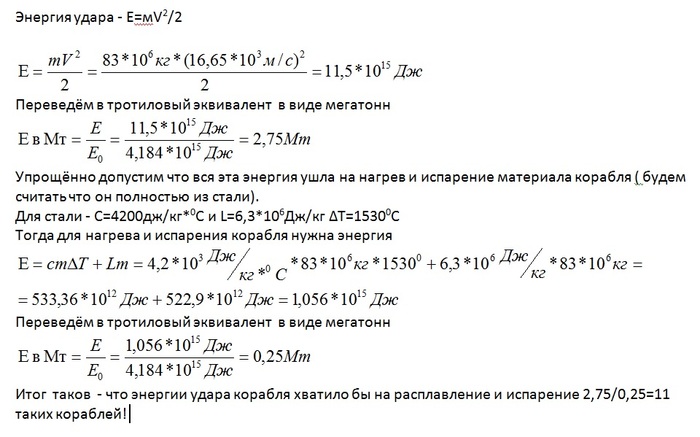 Понять масштаб происшествия поможет энергия удара.- для её нахождения нужна масса и скорость корабля. Массу мы знаем - m=83000т=83 000 000 кг. Скорость корабля - нам неизвестна, но можно попытаться принять по её минимальному её значению для межпланетных путешествий - это третья космическая скорость равная V=16,65км/с/