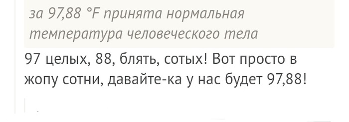 Вторая точка 32 °F была точкой плавления льда, т.е. температурой смеси льда и воды в соотношении 1:1 (0 °C). Третья точка – это нормальная температура человеческого тела, которой он приписал 96 °F (позже ее уточнили и теперь она составляет 98 °F). Опираясь на эти точки, Фаренгейт и построил шкалу своего градусника, добавив туда затем еще и четвертую константу - температуру кипения воды (212 °F). Правда, наука к тому времени уже знала, что температура кипения воды может меняться в зависимости от атмосферного давления, поэтому Фаренгейт эту точку к основным не относил.