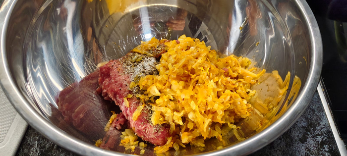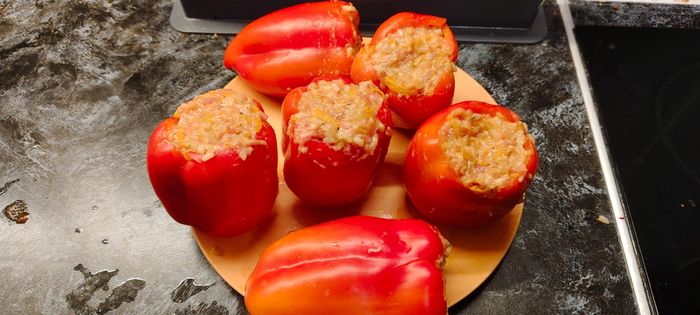 Болгарский перец, фарш (домашний), яйцо, рис, лук, морковь, чеснок, перетертые томаты, масло, соль, перец, прованские травы ( ещё душистый перец и лавровый лист забыл выложить).