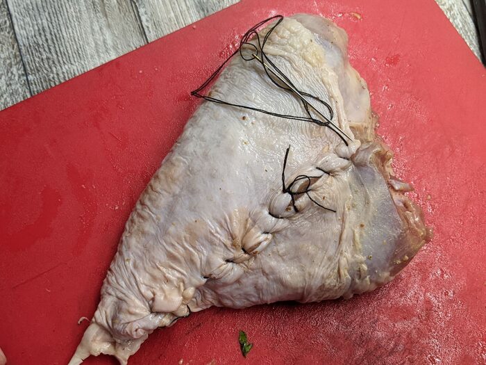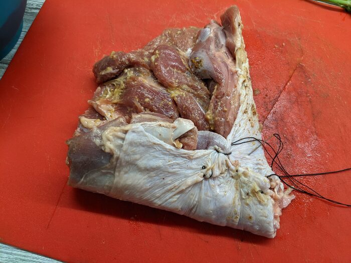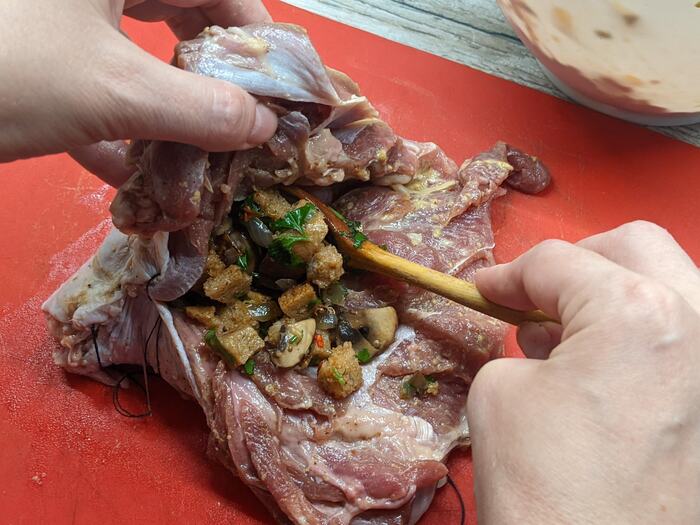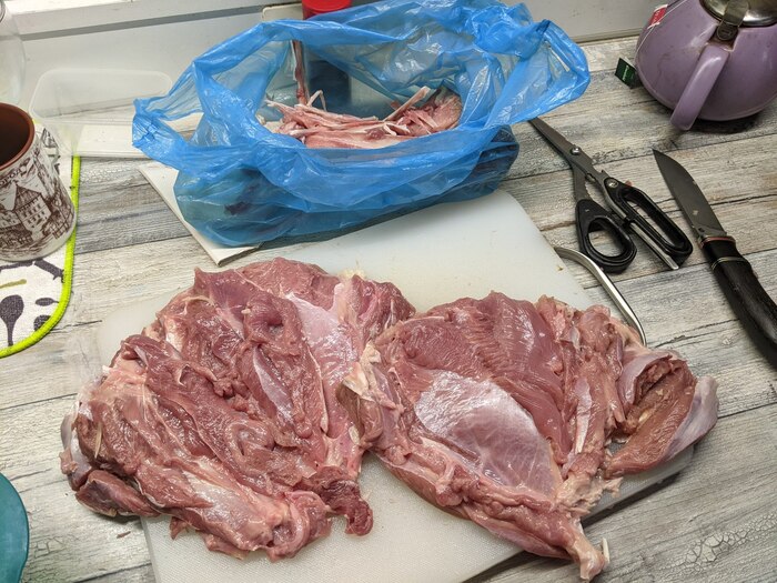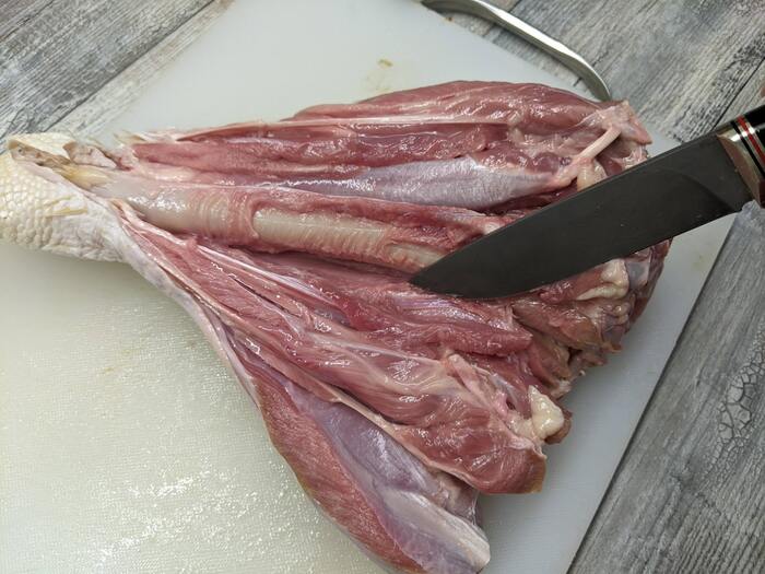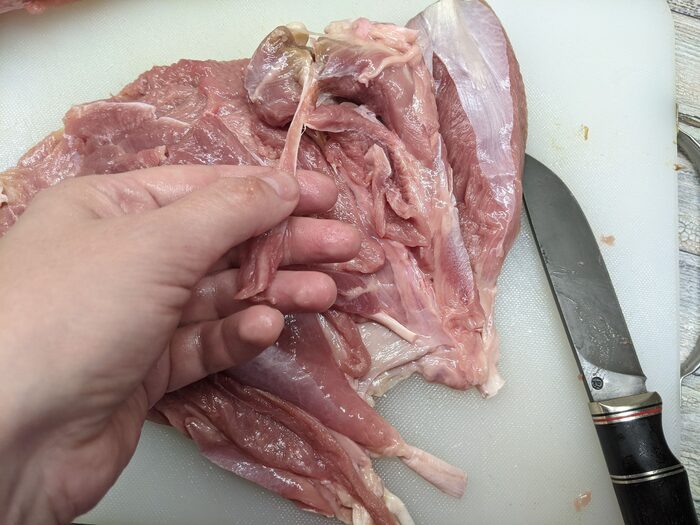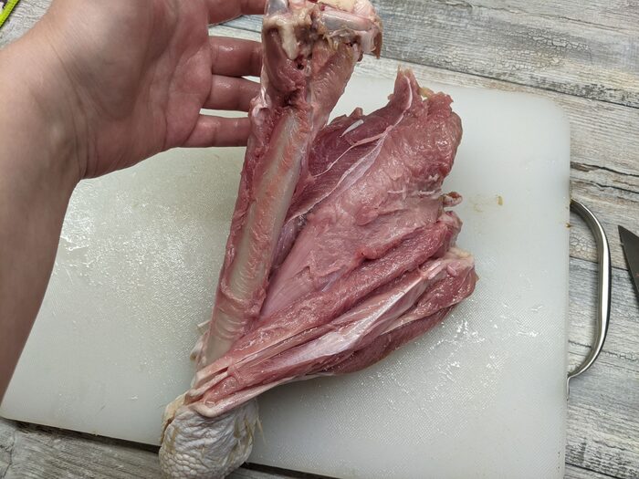 На этом фото хлеба еще нет, а индейка уже без костей ))). Да, начала с того, что удалила из голеней кости. По всей длине ноги в самом тонком месте мякоти (то есть там, где кость ближе всего к коже) рассекла вдоль и аккуратно кончиком острого ножа вырезала косточку. Отсекла всю мякоть от нижней части голени.