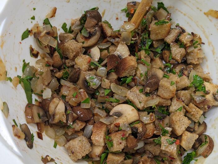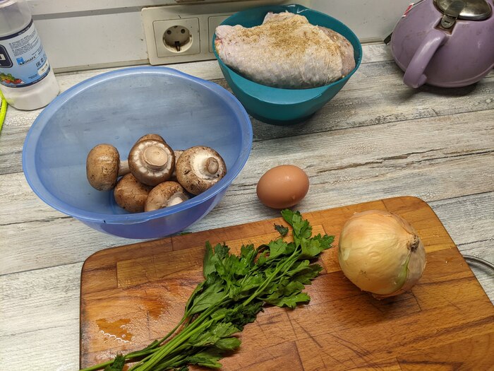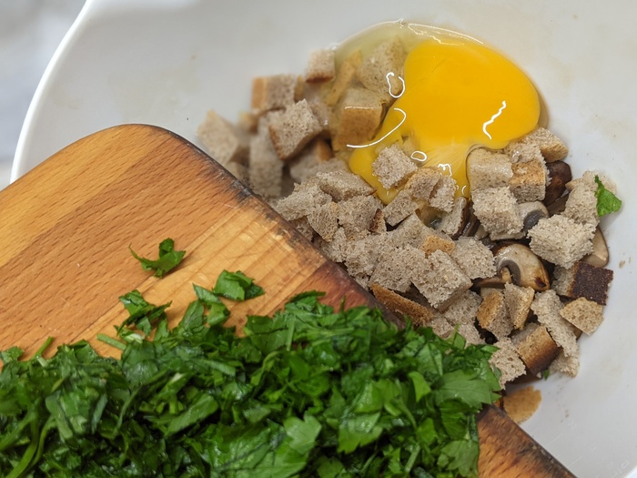 Смешала в миске грибы, лук, яйцо и петрушку. Посолила.