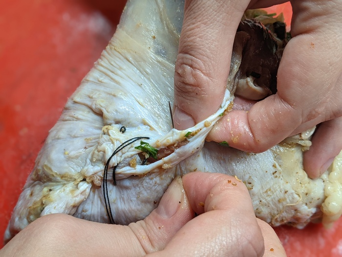 Тут две стратегии: сначала захватить только кончик в нижней части голени, потом уже с начинкой зашивать полнлостью...