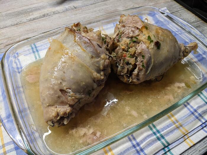 Признаться, нечасто готовлю голени индейки, потому что умумукаешься их резать - кто пробовал, тот знает, вся мякоть пронизана тонкими и очень жесткими «струнами» сухожилий (?). И вот после последних опытов с курицей и обсуждения филетирования пришло мне в голову, что ведь и ноги эти можно обескостить и потом чем-нибудь нафаршировать. После вареников у меня как раз осталось штук пять-шесть грибов, погуглила, какие вообще бывают фарши для индейки, привела это все у себя в голове к некому общему знаменателю... И вот что вышло.