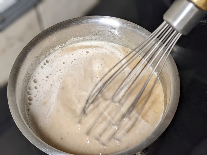 Готовые накрыла фольгой, пусть отдохнут. Жидкость из формы слила, процедила от комочков и - пока все запекалось, я приготовила в ковшике основу для соуса, просто обжарила на масле ложку муки, как на бешамель - прогреваю на небольшом огне до загустения.