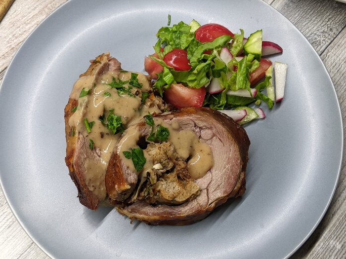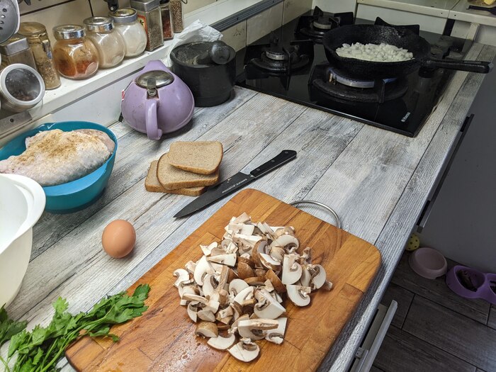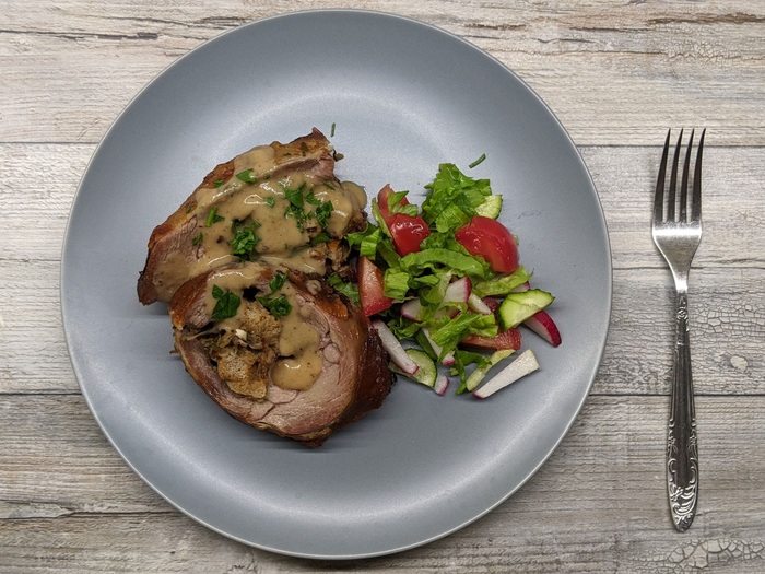 Что скажу, нам понравилось. Это, конечно, не «ужин за 20 минут гости на пороге из того что есть в холодильнике», но проще, чем выглядит на первый взгляд. Хлебушек пропитался мясным соком, лук сладенький, грибы душистые. Мясо мягкое и сочное, с учетом того, что индейка не особо жирная сама по себе, да еще и заморожена по моим подозрениям была больше одного раза, очень даже неплохо. Ну и одно то, что нет этих ебучих лесок внутри, уже радует )))).