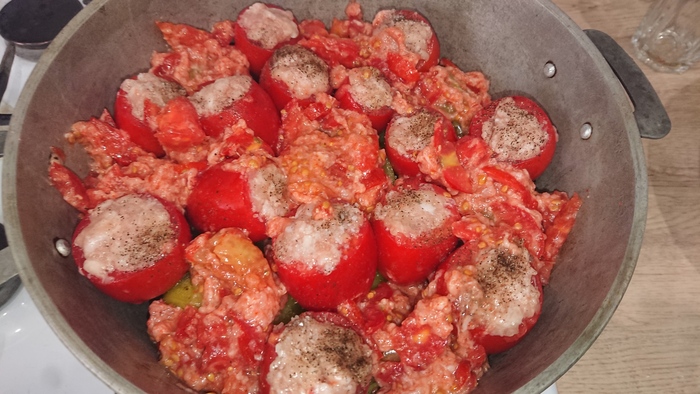 Остатки фарша и помидор перемешал вместе, с добавлением приправ. И залил фаршированные овощи.