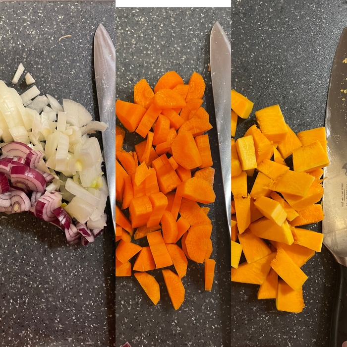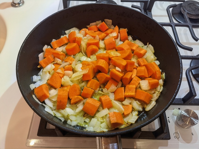 Все овощи мелко нарезать и обжаривать на масле и сильном огне.