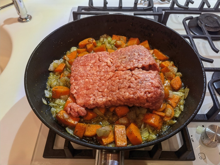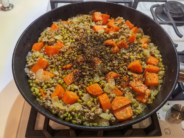 Добавляем томаты из банки и притушившем до мягкости. Добавить специи.
