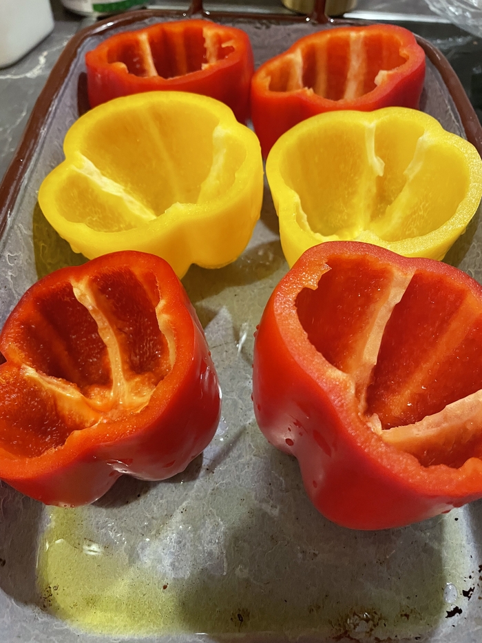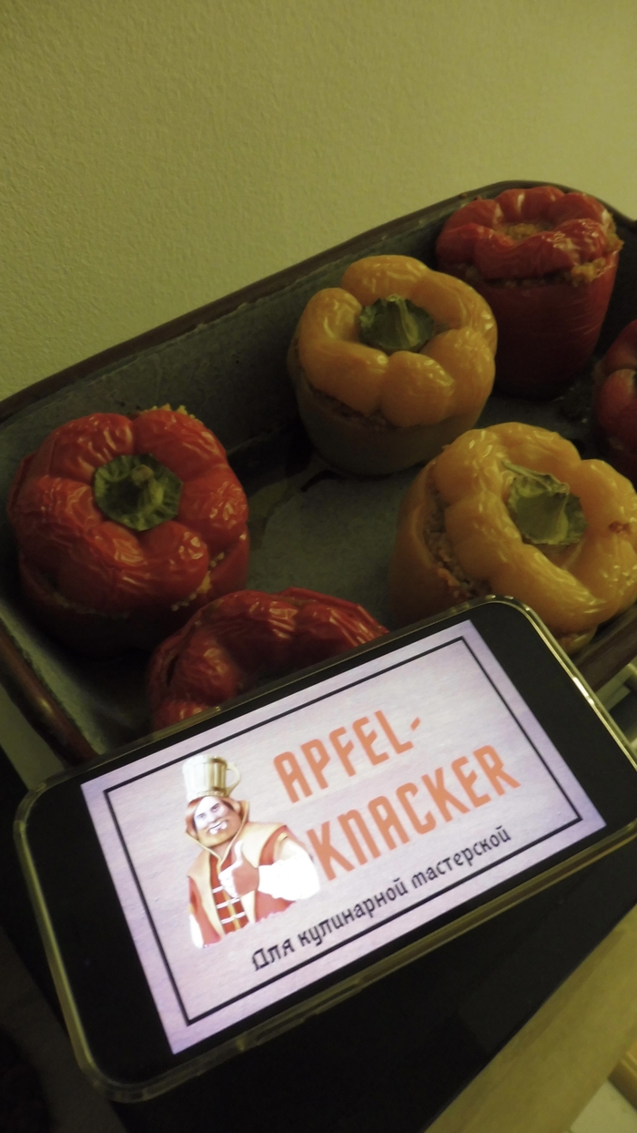 Начинить этим перцы и поставить в разогретую духовку. 200 градусов на 30 минут.