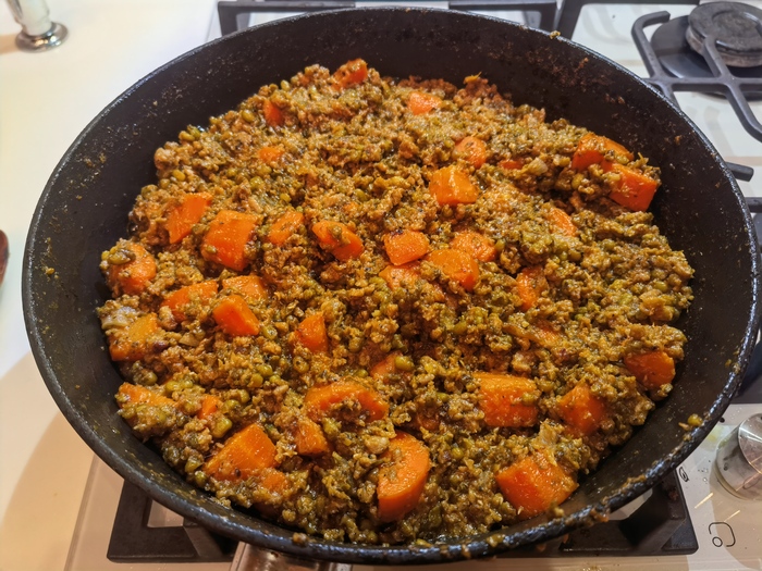 Кускус залить кипятком и после приправить специями. Смешать с овощами из сковороды.