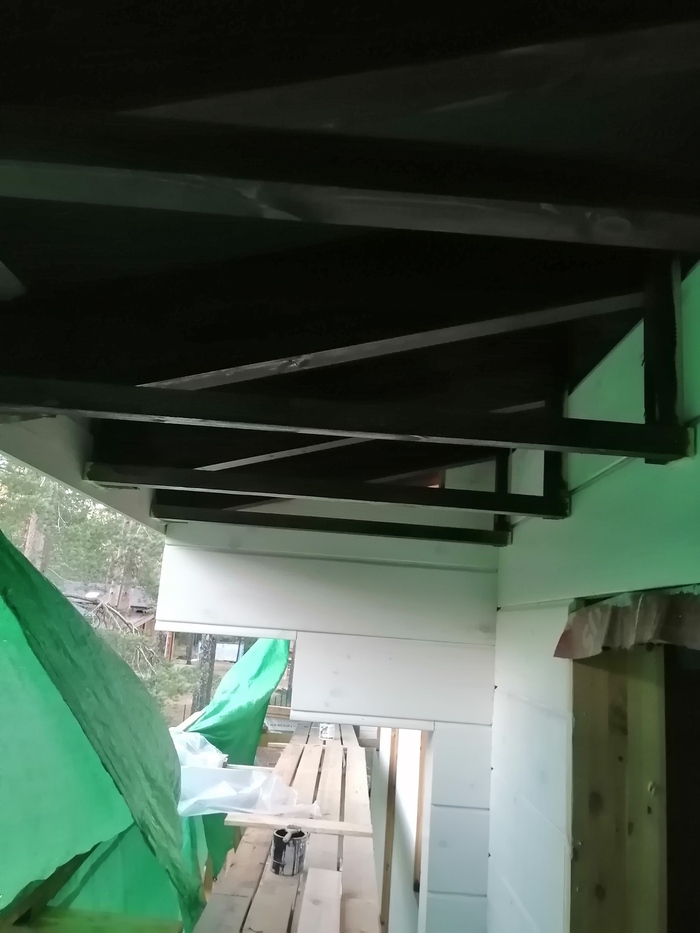 Там, где стропила выпирали, подрубалось и потом подкрашивалось. Всë выставлено по уровню.