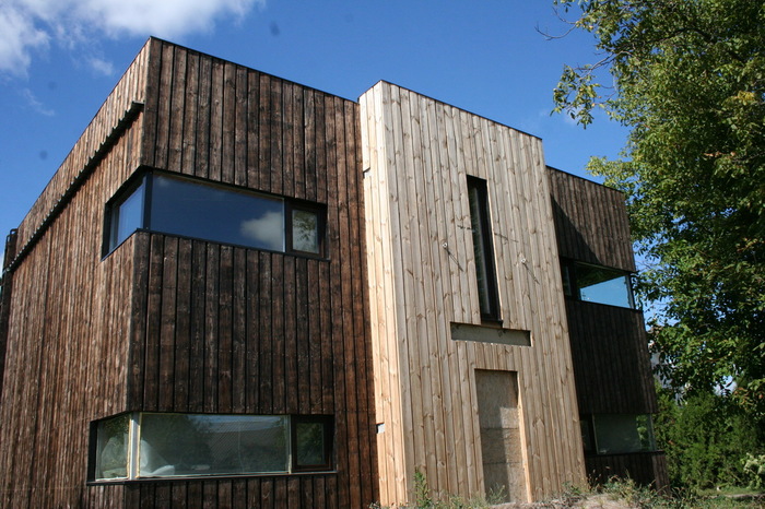 Часть фасада для контраста была покрыта обычной не обожжённой сосновой доской.