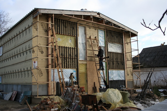 Потом на дом набили горизонтально брус 40*40 мм. с шагом примерно 0,7 м.