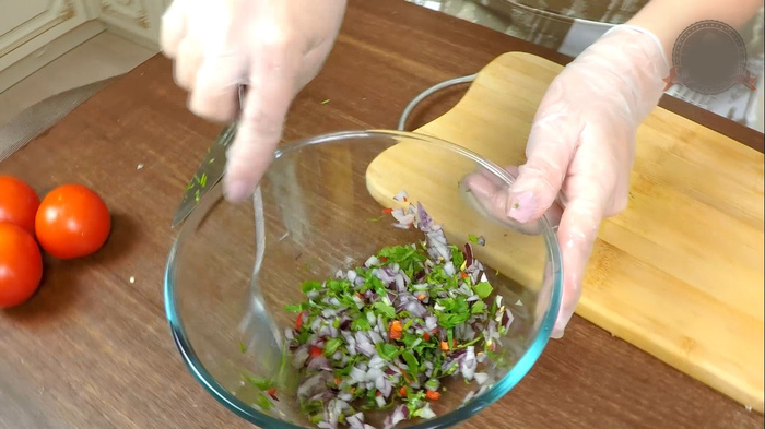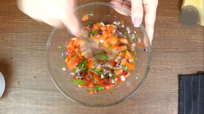 * Одним из важных элементов в блюде является острый соус с названием петушиный хвост. Займемся его приготовлением. Петушиный хвост, он же «Пико де Гальо»- шикарный острый соус. Для него нарезать очищенный красный лук на мелкие кубики. К луку нарезать мелко-мелко красный жгучий перец. Небольшой пучок кинзы тоже нарезать мелко. Смешать все в глубокой миске. Из 1-го лайма отжать сок. Лук при этом станет мягче по вкусу. Разрезать помидор на тонкие полукольца, затем на полоски и на мелкие кубики. Переложить в миску. Добавить немного сахара - это замедляет воздействие острого перца на язык. Хорошо перемешать. Соус готов.