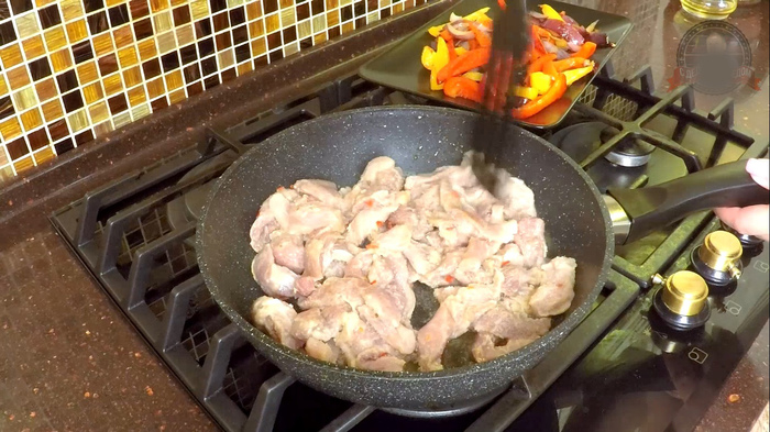 Берём сковороду с толстым дном. Хорошо её прогреваем, затем наливаем масло и обжариваем мясо с овощами на большом огне. Главное постоянно мешайте, чтобы не пригорело. Курице достаточно 3-5 минут, а свинине или говядине около 7-10 минут.