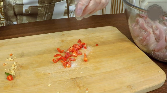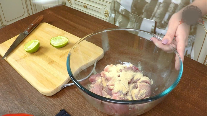 * Займемся приготовлением начинки. Мясо (у меня свиная лопатка, можно заменить курицей или говядиной) необходимо предварительно замариновать, но сначала его нужно нарезать на стейки, затем на полоски примерно одинакового размера. Выложить в чашу. Лайм помыть и разрезать пополам. Отжать сок половины лайма на свинину (можно заменить привычным лимоном). Добавить 2 ч.л. сухого чеснока и 0,5 ч.л. зиры по желанию. Перемешать руками. Добавить 2 ст.л. растительного масла. Жгучий красный перец мелко порубить, присыпать солью и еще раз порубить. Затем размять плоской стороной ножа в пюре. Добавить растертый перец вместе с соком в свинину и хорошо перемешать, сделать так называемый массаж, чтобы все специи и перец хорошо промариновали мясо.