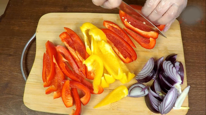 * В начинке кроме мяса будут еще и овощи, которые необходимо подготовить для жарки. Красный лук очистить и разрезать пополам. Затем каждую половину нарезать на дольки. Болгарский сладкий перец помыть, разрезать пополам, очистить от семян и нарезать вот на такие полоски.