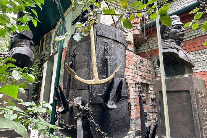 На придомовой территории установлены скульптуры Семена Дежнева, великого князя Московского Ивана III Васильевича, преподобного Сергия Радонежского, бюсты Федора Ушакова, Владимира Высоцкого, Павла Нахимова и Ермака Тимофеевича. Здесь же размещена большая экспозиция, в которую вошли корабельные якоря разных форм и размеров, колокола, якорные цепи, штурвалы и альпинистские ледорубы.