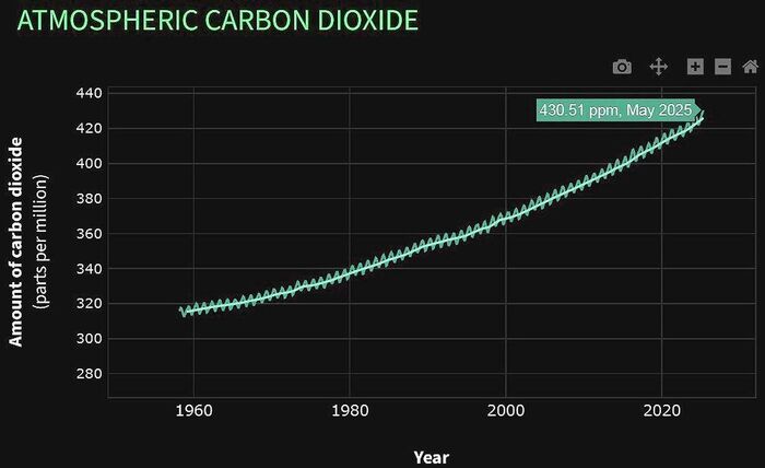 В мае 2025 года среднемесячная концентрация CO₂ достигла 430.2–430.5 ppm, что является абсолютным рекордом за всю историю наблюдений (уровни времен плиоцена 4.1–4.5 млн лет назад). Текущие темпы роста (~3.6 ppm/год) в дальнейшем будут возрастать.