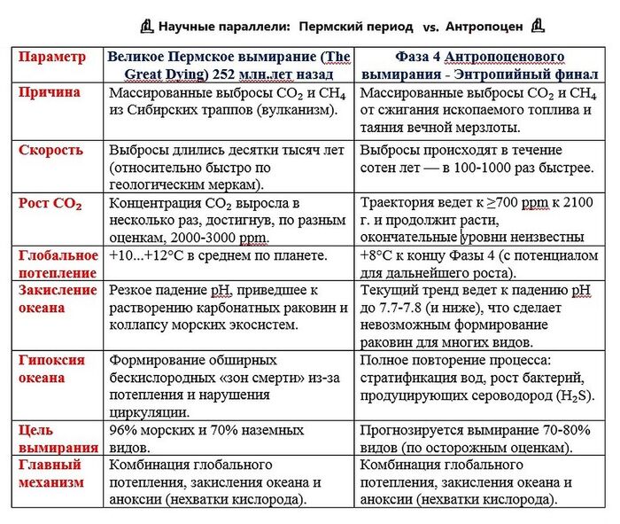 > Исторический прецедент: Во время прошлых массовых вымираний подобное падение продуктивности океанов было ключевым признаком и драйвером катастрофы. Будущее Великое Антропоценовое вымирание по своим масштабам будет сопоставимо с Великим Пермским вымиранием: