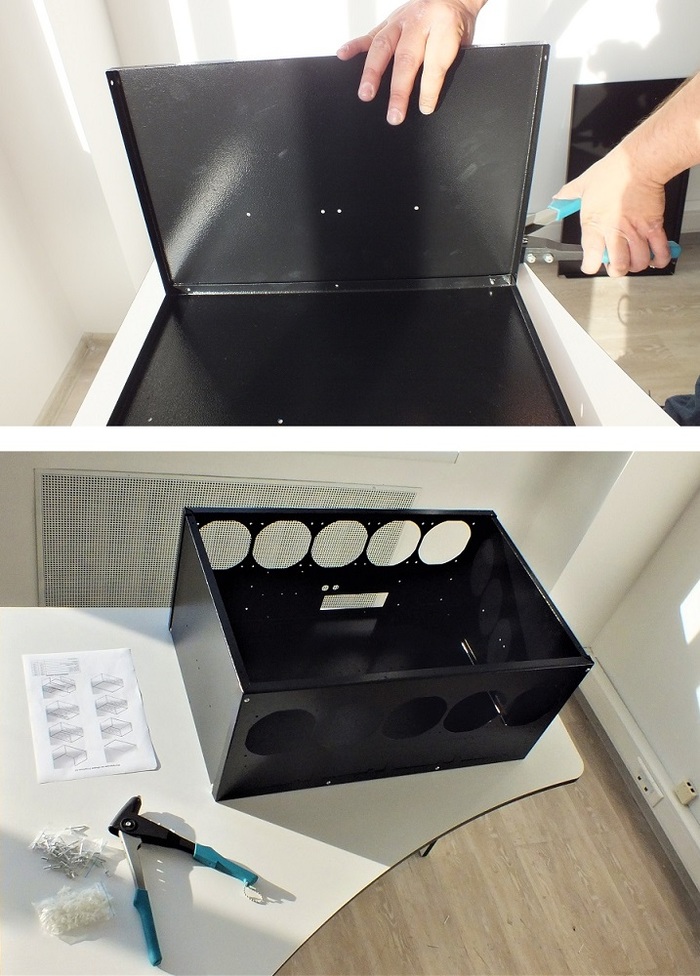 Скрепили две первые панели и далее по нехитрой инструкции собрали остальное. У нас корпус на заклепках – говорят так надежнее. И барбекюшница корпус практически готов.