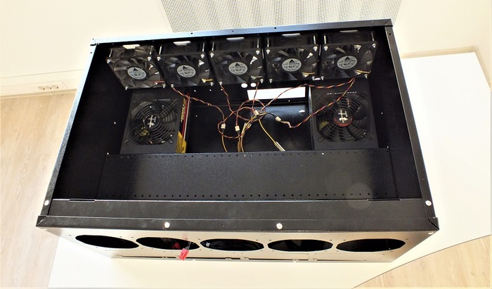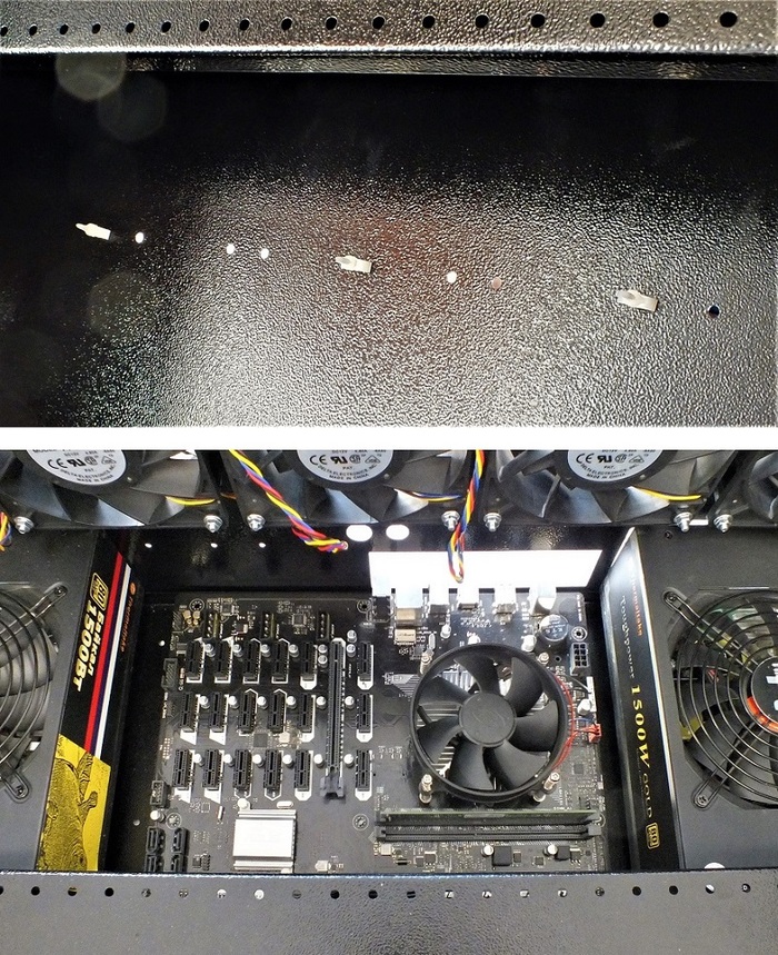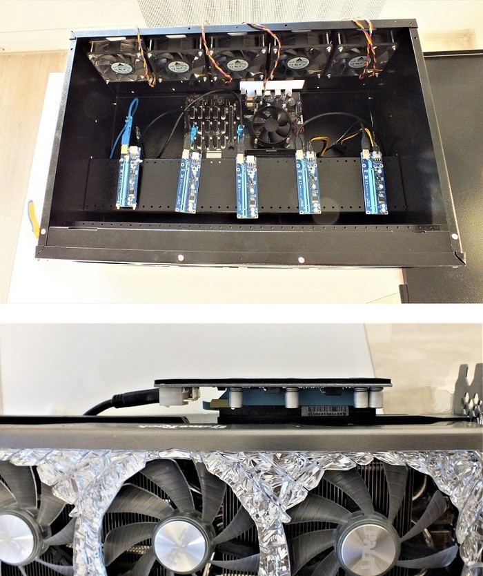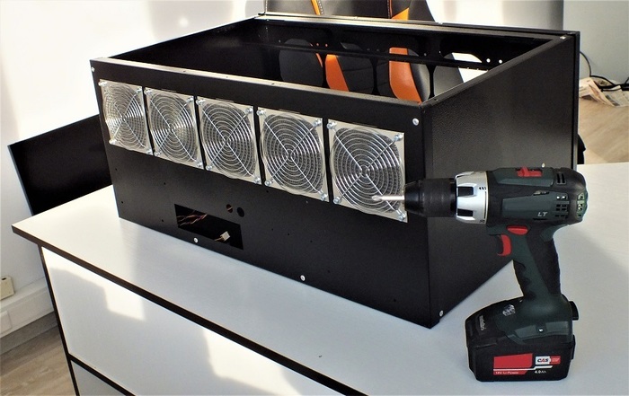 Корпус. Берем покупной, в нем уже продумано расположение полок, точек крепления плат, блоков питания и вентиляторов. В закрытой ферме продумана также организация воздушных потоков. Но ферму можно сделать и самому (в целях пожарной безопасности желательно не из дерева). Корпус может быть на 6, 9 и 12 видеокарт и их (корпусы) можно ставить до 8 штук друг на друга. Вес от 6 до 10 кг. Стоимость от 4 до 6 тыс. рублей.