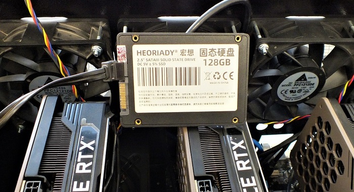 Материнская плата. Она отличается от платы, что стоит в обычном системнике по крайней мере тем, что в ней много разъемов под графические карты и иные специализированные компоненты. На конкретной ферме применена плата ASUS B250 Mining Expert/Celeron G3930/4GB RAM/Heoriady SSD 128GB. 19 слотов PCle, 3 разъема питания ATX 12 В. Стоит 6 тыс. руб.