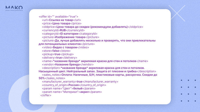 Товарный фид в Я.Директе ориентируется на характеристики вроде материал, цвет, тип, объём — особенно важно в нише ЛКМ. Мы добавили в фид структурированные данные: