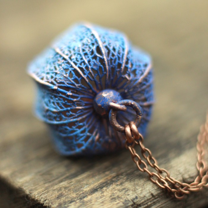 Недавно я увлеклась гальваникой (наращивание слоя меди на объекте). Это новое направление в современных украшениях. Если вы когда-нибудь видели работы гальванистов, то знаете, что физалис очень распространен. Это маленький пунктик, который должен попробовать хоть один мастер. Трудная обработка самой коробочки(с нее нужно снять верхнюю кожицу и всю мякоть), проблема с креплением и "заломами" сторон... Все это с лихвой окупается в итоге волшебным видом. Тонкая сеточка прожилок, покрытых медью, проглядывающая бусина внутри или наоборот, только воздух, заключенный в объятия металлической сеточки. Легкий и хрупкий на вид, на ощупь приятно-тяжеленький и твердый.