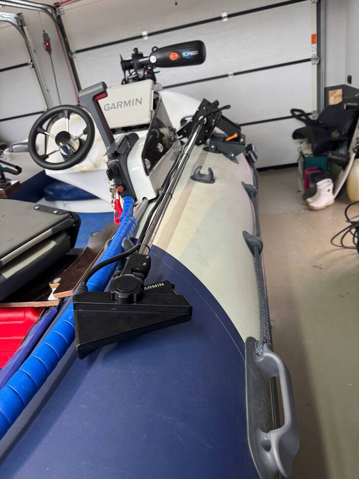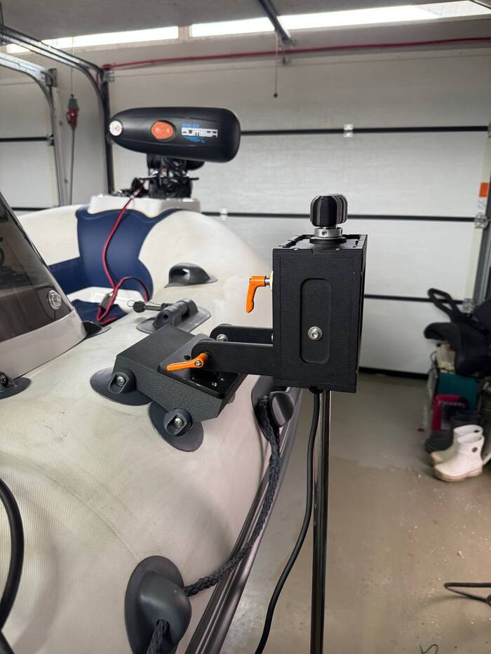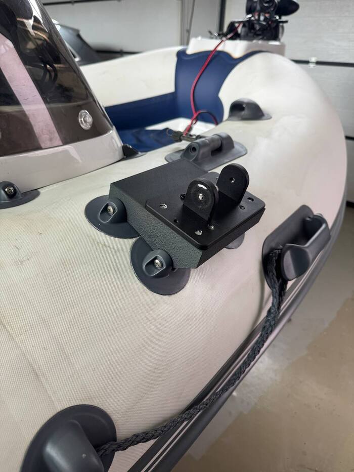 1. Монтировочная база для эхолокатора надувной лодки (зеленый пластик): Модель получилась крепкая с отлично пропечатанными отверстиями под крепёж, в слайсере допуски на отверстия я не выставлял. Она успешно выдержала нагрузку и не деформировалась после крепления эхолокатора. Правда с целью обезопасить от УФ была покрашена в чёрный цвет.