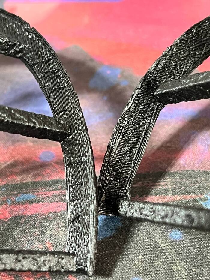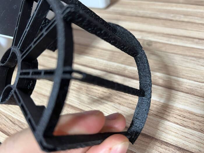 3.Черный филамент я использовал для печати заказа решёток квадрокоптера, там много тонких элементов, которые я печатал соплом 0,6мм в два слоя. Элементы получились достаточно крепкими, но на мой взгляд я немного перебрал с температурой так как поддержки хоть и отрывались, но подложку (соединительный слой) приходилось отрывать отдельно, так как он всё же немного прикипел.