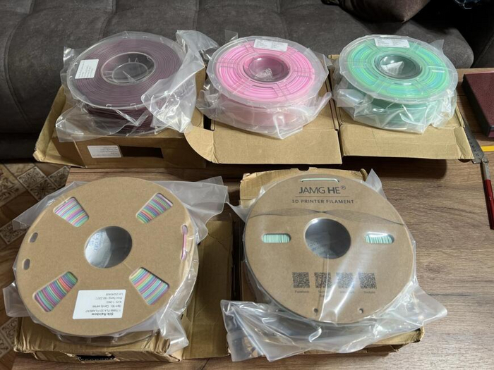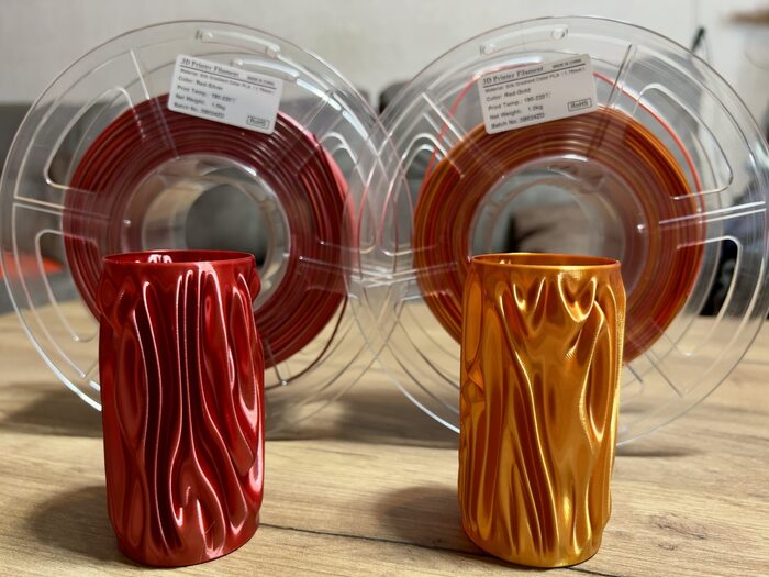 Я выбрал два цвета: красно-серебряный и красно-золотистый. При распаковке я был приятно удивлён качеством филамента: он с ровной намоткой, без видимых дефектов и неровностей прутка, а также имеет красивый блестящий эффект. Это обещало отличные результаты при печати.