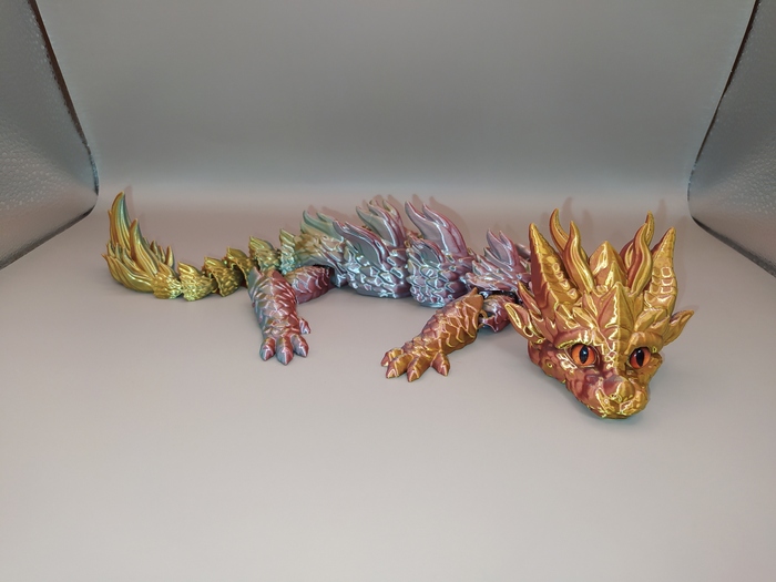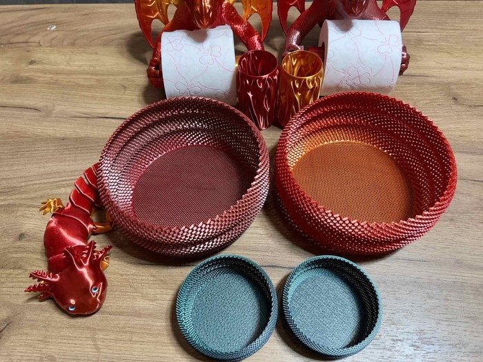 Я начал печать с красно-серебряного филамента. Процесс печати шел гладко, и уже на ранних этапах работы я заметил, как яркие цвета начинают сочетаться друг с другом. Сначала я печатал стаканчики что бы оценить настройки температуры и потока. А потом я поставил двух туалетных драконов которые мне заказали. Модели доступны в интернете на сайте принтейблс бесплатно.