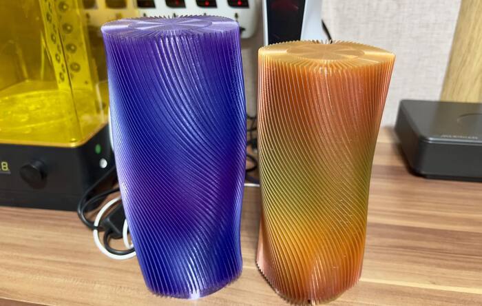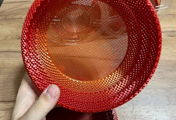 Этот филамент не требует особых условий для печати и хорошо прилипает к рабочей поверхности, что позволяет избежать проблем с деламинцией. Я напечатал две чаши используя на дне только заполнение "перекрёстная решетка" и тонкие слои хорошо легли на стол и не деформировались в процессе печати. А плавные переходы между двумя основными цветами создают уникальные и яркие эффектные модели, которые будут привлекать внимание!