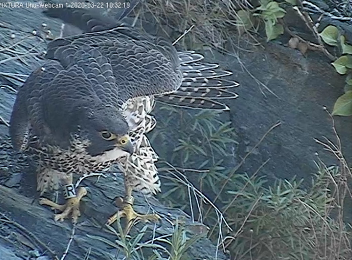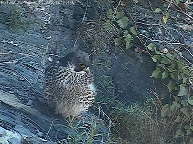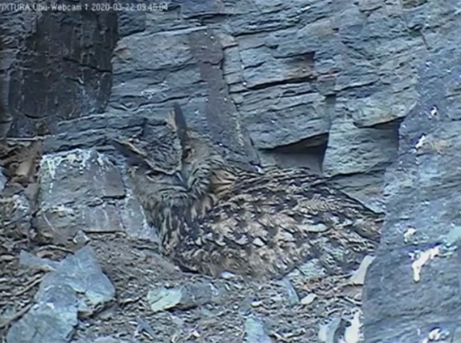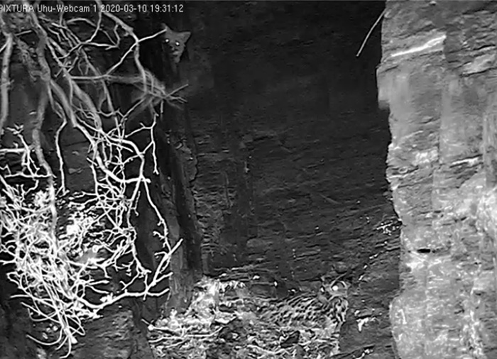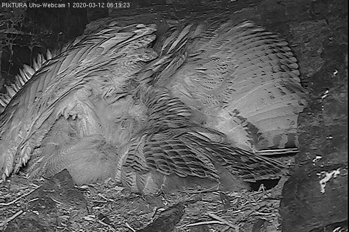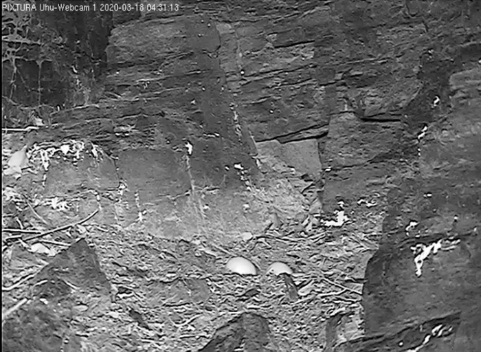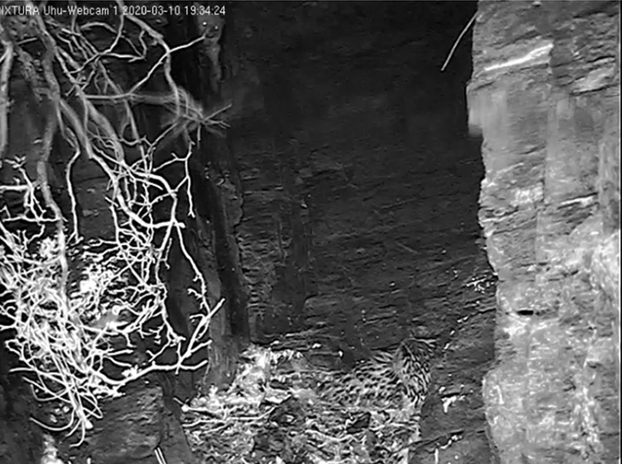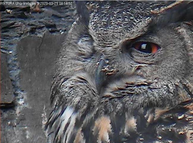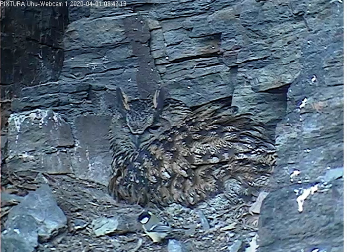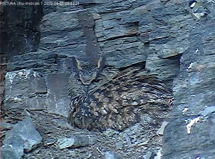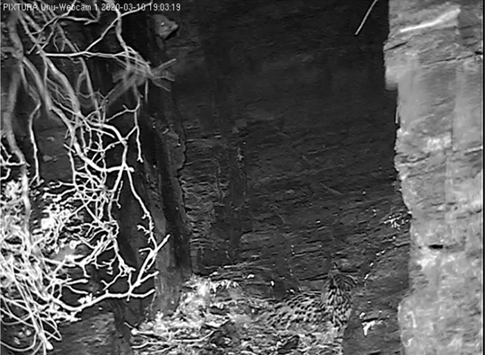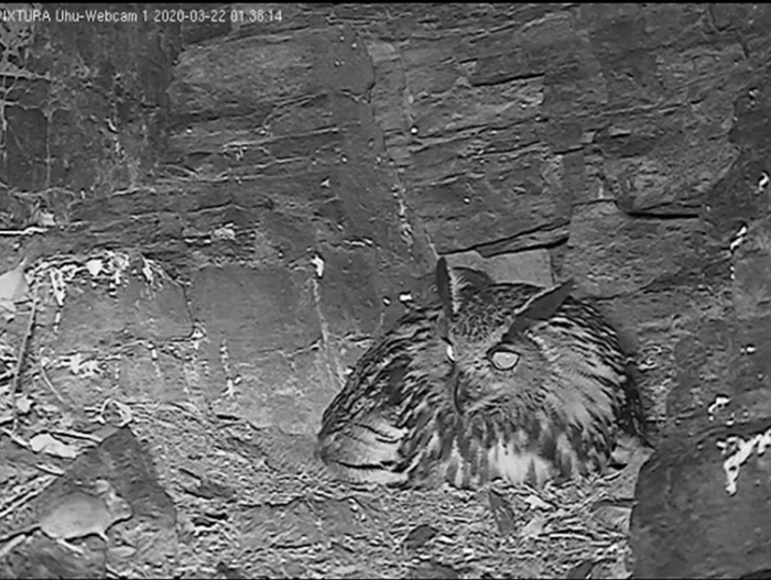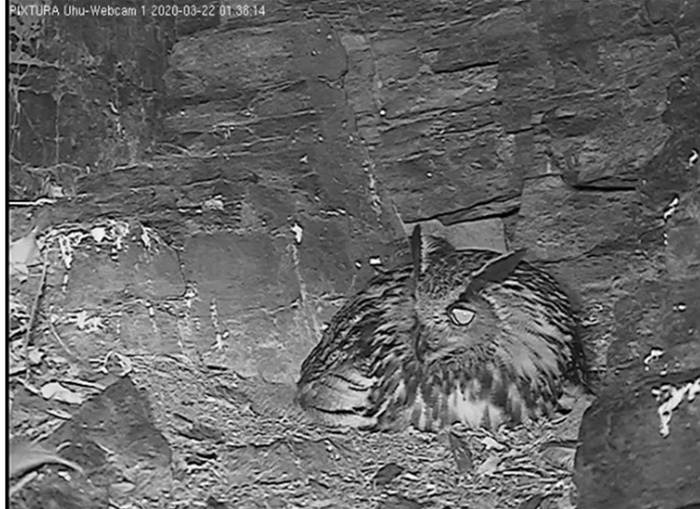 Место действия – Германия, регион Айфель. Местное «Общество любителей сов» установило видеокамеру на скале, трансляция идёт круглосуточно уже несколько лет. Сова (филин) – дикая, окольцованная в 2008 г.