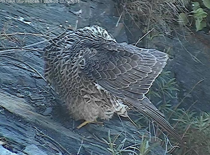 То сапсан пришёл отдохнуть и почти час чистил пёрышки, дремал, вытягивал лапки.