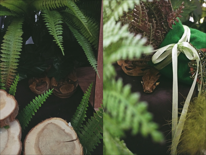 Шикарный браслетик, но увесистый =) Хозяйка все ворчала, что даже у нее он так спокойно не сидит. У меня же он свернулся в узелок и сидел около получаса, пока мы монтировали фотозону. А когда я стала раскладывать свой стенд - в одну секунду развязался и залез спать в папоротники =)