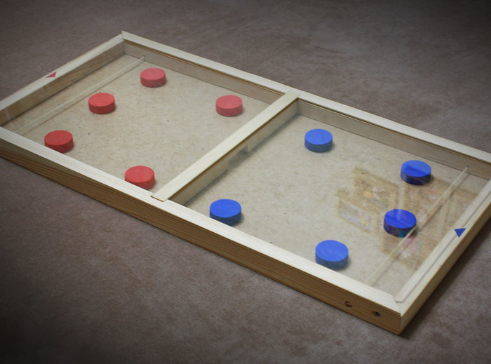Решил сделать одну супер активную настолку для малых. Правила оч простые: необходимо на раз-два-три одновременно, как из рогатки, вы стреливать шайбы на своем поле, попадая в общие ворота. Выигрывает тот, кто загнал последнюю шайбу на поле оппонента.