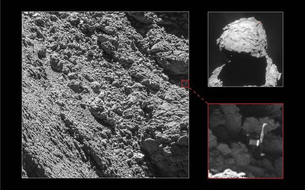 Только теперь, когда «Розетта» сильно приблизилась к комете, удалось обнаружить Филы. Один пиксель этой фотографии в оригинальном разрешении соответствует 5 сантиметрам на поверхности кометы. Корпус Филы имеет размер около 1 метра.