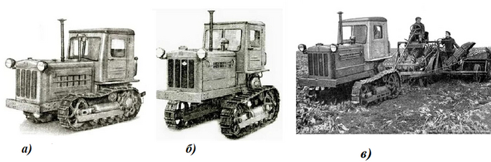 Рис. 6: а)Трактор КД-35, б) КДП-35. в)Уборка сахарной свёклы свеклоуборочным комбайном СКЕМ – 3 с трактором КДП – 35. (СКЕМ) –Сиваченко, Кореньков, Еремеев, Мельников. За создание этого комбайна они получили Сталинскую премию.До этого уборка сахарной свёклы не была полностью механизирована . Фото из открытых источников