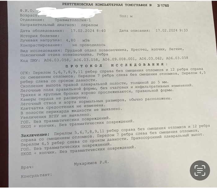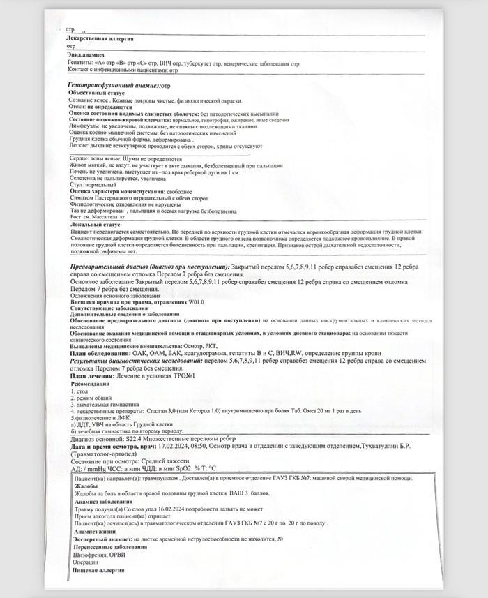 На следующий день утром они поехали в травмпункт. В травмпункте диагностировали множественные переломы ребер. Некоторые со сроком давности.