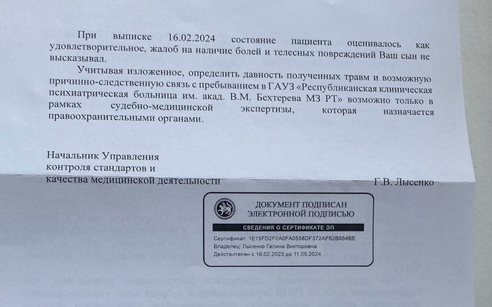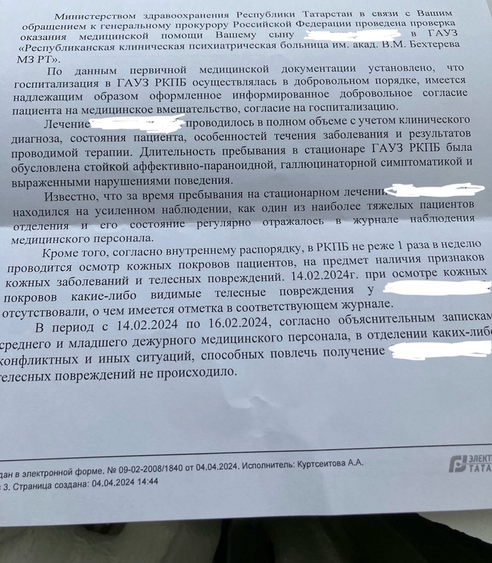 Только после выписки оттуда мама созрела на обращение в прокуратуру,и я подала заявление. Недавно она мне скинула фото ответа.