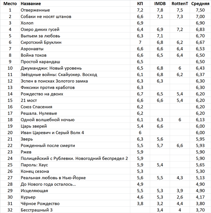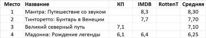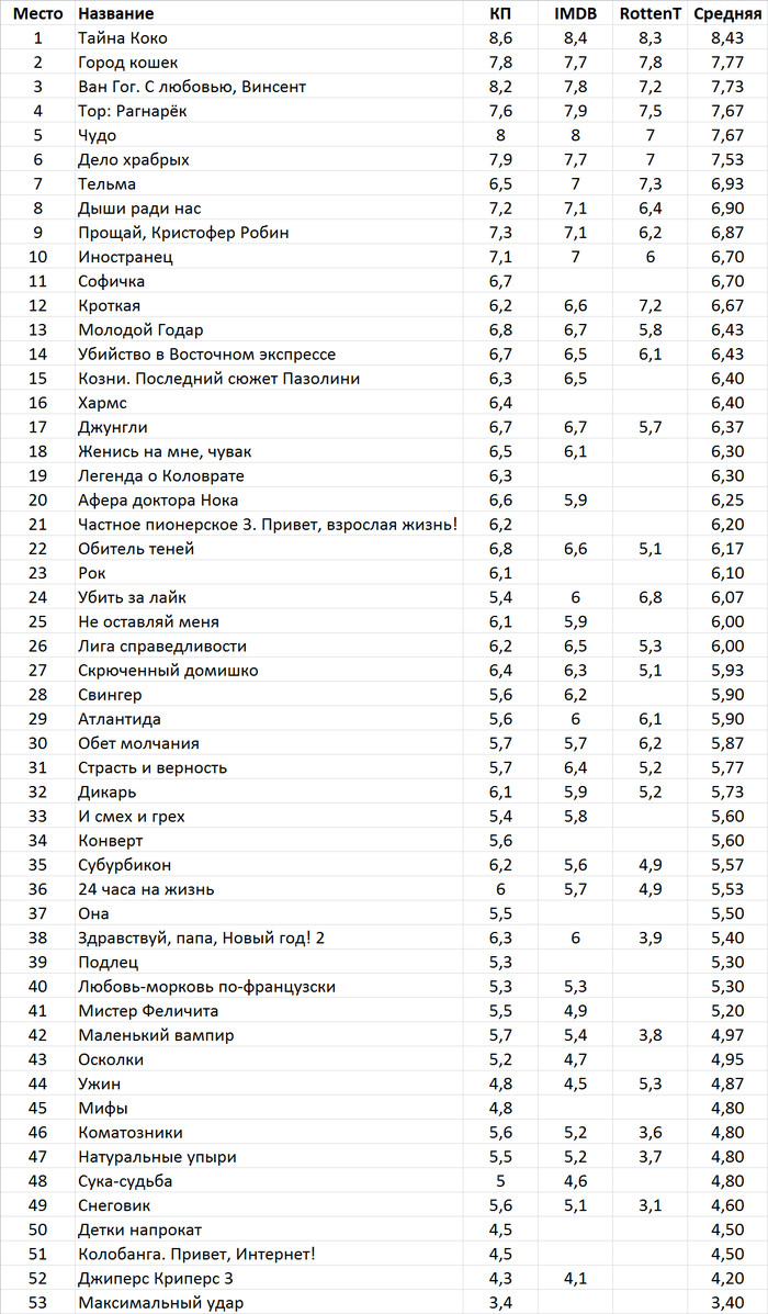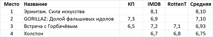 Таблица с рейтингами Кинопоиска, IMDB и Rottentomatoes.
