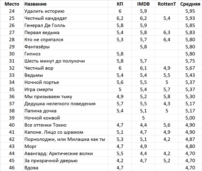 Таблица с рейтингами Кинопоиска, IMDB и Rottentomatoes.