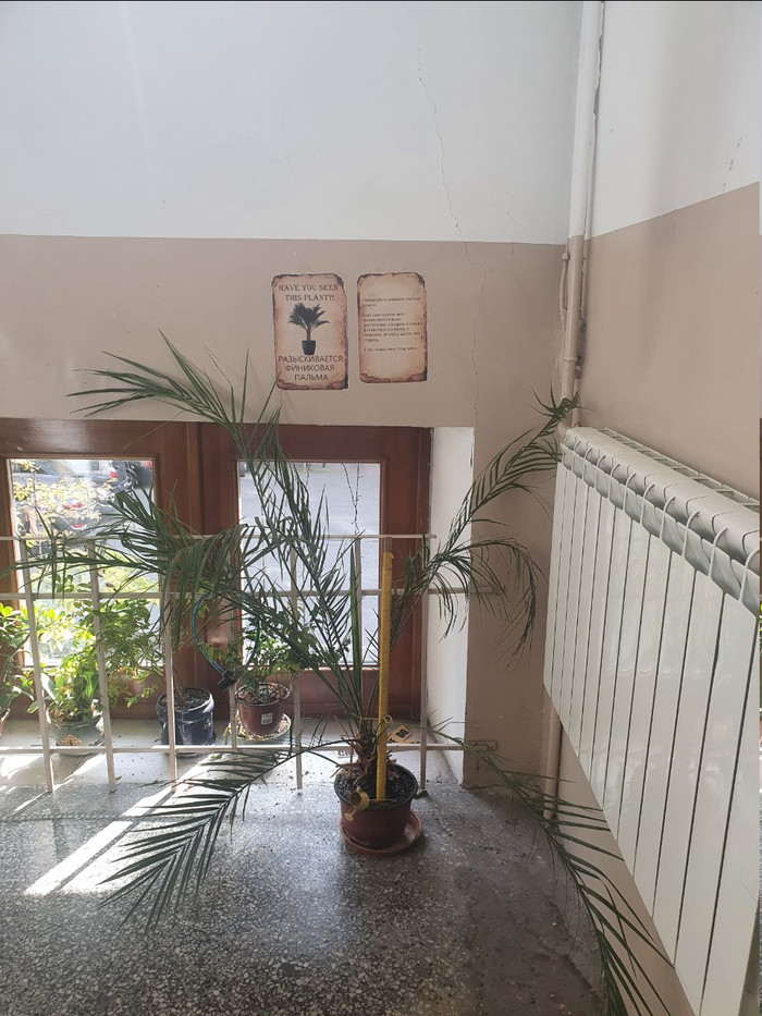 Кстати, у него есть сводный брат, а может сестра (финиковые пальмы разделяют традиционные ценности). Несмотря на почтенный возраст, половые признаки в виде цветов, так и не появились. Интернеты говорят, что в неволе они вообще не плодоносят. Короче, сиблинг тоже прошёл процедуру обрезки и сейчас страдает: