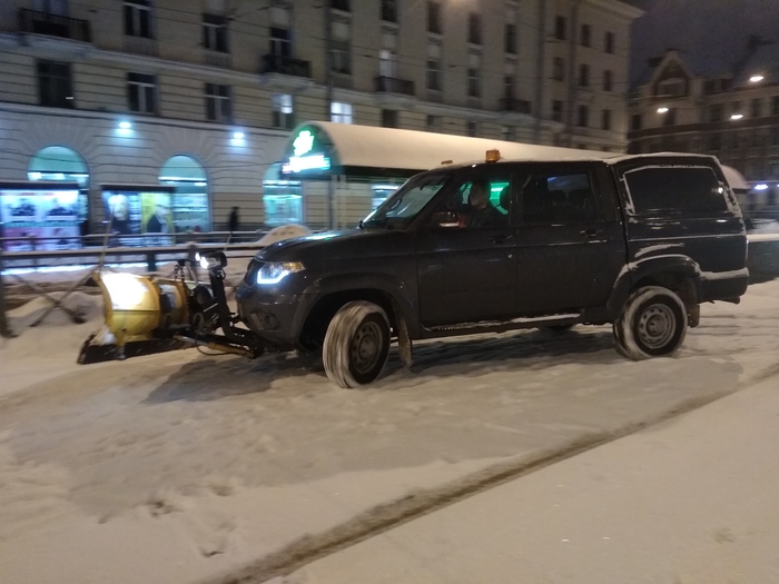 Только что на Финляндском вокзале заметил легковой джип а-ля УАЗ-патриот, который ловко сметает снег с трамвайных путей при помощи прикреплённого к нему стандартного ковша от снегоуборочной машины. Испытал, честно сказать, культурный шок. Кто-нибудь видел нечто подобное?