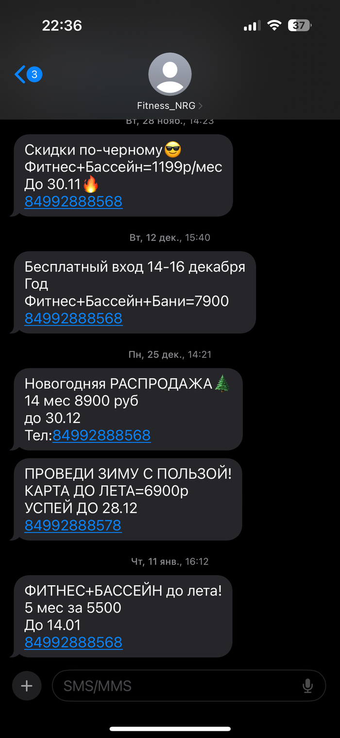 С различной периодичностью беру абонемент в фитнес зал, который мне удобен и находится в бункерном подвале многоэтажного дома, но из-за прошлых переездов приходилось выбирать фитнес-клубы. Поэтому мой номер телефона разошелся по всем чертовым базам фитнес-клубов. И шквал смс и звонков, которые никак не прекратить (звонки часть отсеивают всякие голосовые помощники, а вот смс…)